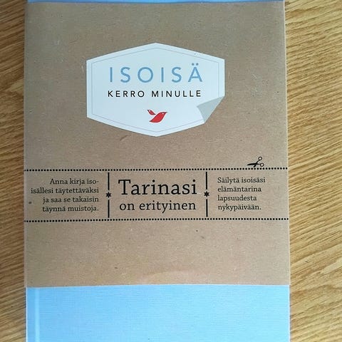 Isoisä Kerro Minulle on kirja, joka sisältää sivuja tarinoiden ja muisteluiden kirjoittamiseen. Kirja on suunniteltu säilyttämään ja jakamaan henkilökohtaisia muistoja ja tarinoita sukupolvien välillä.