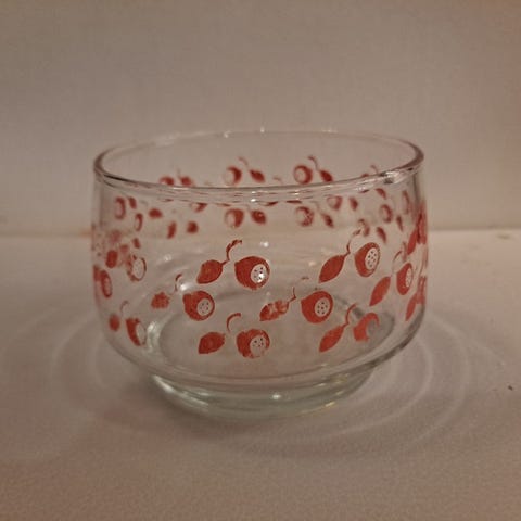 Lasinen kulho, jossa koristeelliset kuviot. Kulho on läpinäkyvä ja soveltuu esimerkiksi tarjoiluun tai koristekäyttöön.