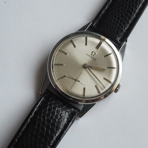 Omega unisex rannekello, jossa on kultainen metallinen mesh-ranneke ja pyöreä kellotaulu. Kellon kuori on ohut ja kultainen. Mukana kaksi ylimääräistä ranneketta, joista toinen on ruskea nahkainen. Kellon takakansi on ruostumatonta terästä.