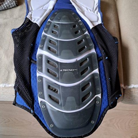 TeknoPro selkäsuoja, tarrat ja vetoketju Ok. Ollut vähällä käytöllä. Aikuisten m koko. Niska-helma 70cm, kainalo-kainalo 50, joustaa.