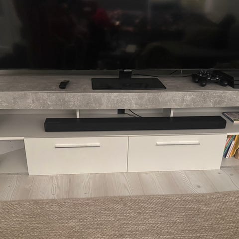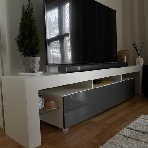 Valkoinen korkeakiiltoinen tv-taso. Kaksi syvää vetolaatikkoa. Hyväkuntoinen. Yhdessä reunassa pieni led valon mötikkä tiukasti kiinni (kuva), en lähtenyt irrottamaan. En pysty tarjoamaan kuljetusta. Espoo Tuomarila-suvela