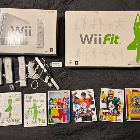 Nintendo Wii Fit konsoli, tasapainolauta, pari kuntoilupeliä (Wii Fit ja Fit Plus) Wii Remote -ohjaimen ja nunchuckin, virtalähteen, av-johdon, ratin, mailapaketin ja sensorbarin.
