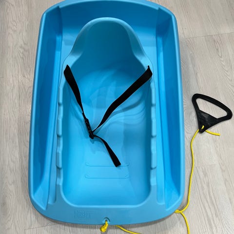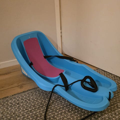 Vauvalle/taaperolle sininen pulkka. Pohjassa jotain naarmuja, muutoin todella hyvässä kunnossa. Vyötäröremmi ehjä ja toimii, samoin vetonaru.