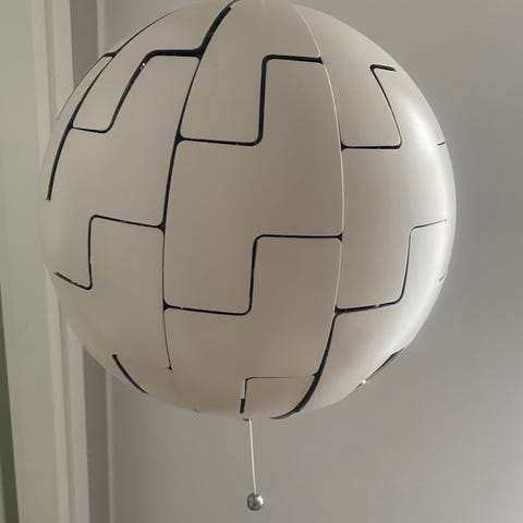Ikean kattovalaisin. Hopea-kiiltävä sisäpuoli, matta valkoinen ulkoa.