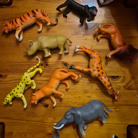 Setti muovieläimiä (ei Schleich): leijona, kirahvi, sarvikuono, norsu, kauris sekä apinoita. Lisäksi kiviä, puita, aitoja sekä kaksi maisema-alustaa.