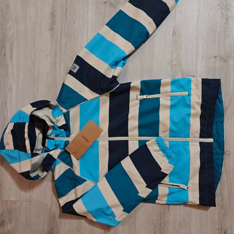 Reimatec uusi Kallahti-takki koko 140. Täysi veden-ja tuulenpitävyys, irroitettava huppu sekä säädettävät kuminauhat alaosassa.