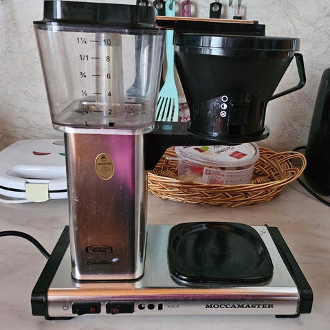 Toimiva Moccamaster, hyväkuntoinen paitsi suodatinpussitelineen kansi jouduttu teippaamaan.