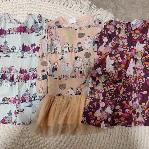 Muumi mekko tytöille, koko 92, väriltään keltainen. Valmistettu puuvillasta. Mekossa on Muumi-aiheinen kuosi. Hintalappu paikallaan.