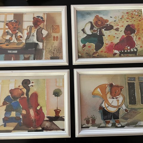 Myydään kehystetyt Minna Immosen leluaiheiset taulut 4 kpl. Kuvakoko A4. Tummansiniset puiset kehykset