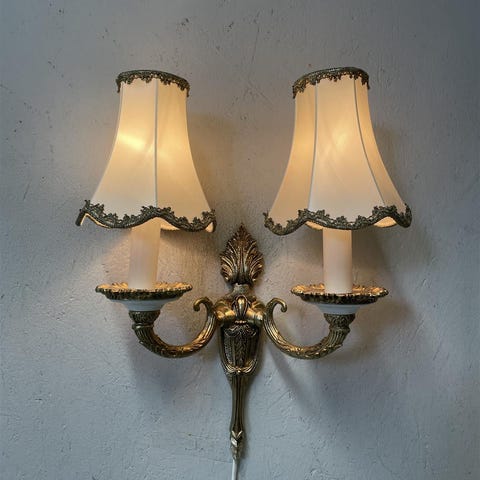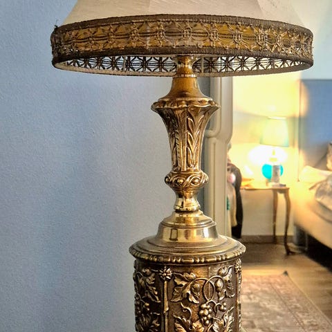 Sario vintage pöytävalaisin, jossa on koristeellinen messinkijalka ja vaalea kangasvarjostin.Valaisimessa on havaittavissa ajan patinaa ja varjostimessa on muutamia tahroja. Messinkiosissa on hieman kulumaa, mutta yleisilme on edelleen viehättävä.Maadoittamaton pistoke.