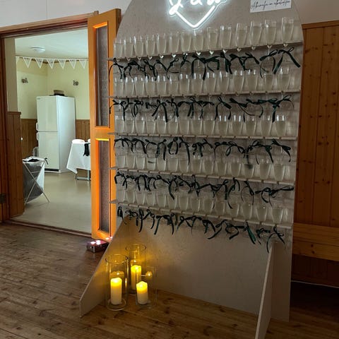 Valkoisesta filmivanerista valmistettu skumppaseinä. Kasaus nopeasti ilman työkaluja, katso video. Kerran käytetty. Leveys 1220mm, korkeus 2000mm. Taittuu puolestavälistä, joten kuljetusmitat 1220x1000x65. Hyllyissä paikat yhteensä 60:lle lasille, mutta kauppaan kuuluu 102 kuohuviinilasia (17x6kpl alkuperäispakkauksissa). Kahvakuula mukaan.