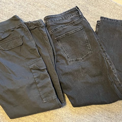 Kahdet todella hyväkuntoiset poikien collegehousut, toiset mustat Warp 158 ja siniset H&M 158/164 koossa.