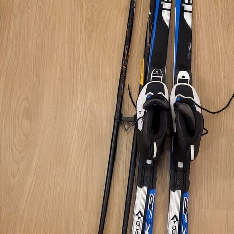 Tecnopro Spark JR Grip huoltovapaat hiihtosukset 150cm. Prolink-siteet, joihin käy myös NNN-monot. Sauvat Tecnopro jr 115cm.