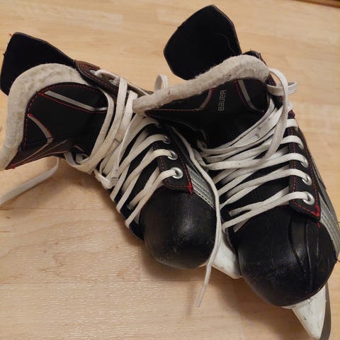 Bauer lapsen luistimet, koko 35. Luistimissa musta ja valkoinen väriyhdistelmä, nauhakiinnitys. Sopivat lasten käytettäväksi jäällä.
