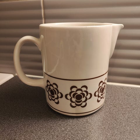 Myydään kannu ja siihen sopivat neljä mukia. Kukkakuvio. Moitteeton kunto