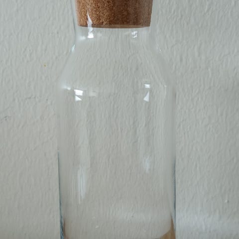Pieni lasinen karahvi korkilla. Korkeus korkin kanssa 23,5cm, haljaisija 7,5cm. Vetousuus n. 0,4 litr. Toimitus postitse, kulut ostajalle. Toki voi myös noutaa.