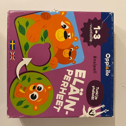 Taaperon eläinmuotopalikat paksuilla palikoilla. Alustassa myös liikuteltavat kellon viisarit. Palikoissa pientä kulumaa.