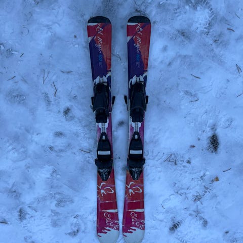 Lasten Elan laskettelusukset helposti säädettävillä siteillä. Pieniä naarmuja ja kolhuja, mutta täysin toimivat ja hyvät sukset aloittelijalle. Yleisilme oikein siisti.