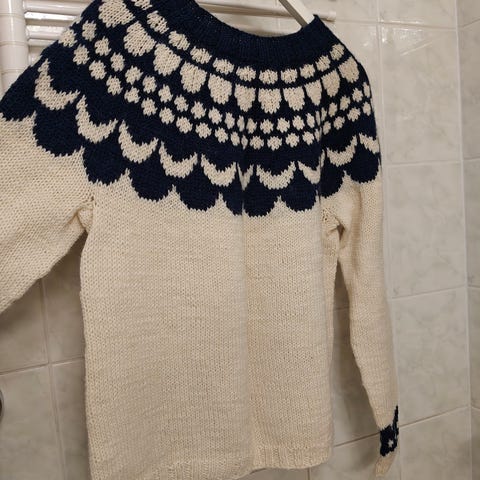 Myyn kuvien käsinneulotun villapaidan.