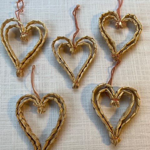 Viisi punaista sydäntä joulukuusenkoristeisiin tai muuhun käyttöön tai muihin koristeisiin kultalangoilla. 4 cm.