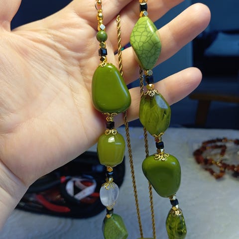 Henkseleitä ei ole käytetty kertaakaan. Ne sopivat kokoa 40 tai pienemmälle. Kaikki helmet ovat muovia ja helmiäispinnoitettuja. Helmiä on käytetty vain pari kertaa.