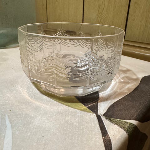 Iittala Kuusi lasi. Suunnittelija Jorma Vennola. Ollut tuotannossa 1980-luvulla.