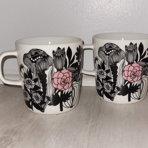 Marimekon Oiva siirtolapuutarha kahvikuppeja 6kpl. Uusia, olisko ehkä kolmesta kupista juotu teet! Käyttöönotto tiskattu, koitettu tartalaput pohjasta poistaa, käytön jälkeen pesukoneessa käyneet. Tarralaput ei kerenny pesussakaan lähteä ees kokonaan joten niistä osat vielä pohjissa. Nämä olleet kaapissa josko tulisivat käyttöön, mutta unelma astiasto tulossa joten nämä uuden tieltä valitettavasti poissa vaikka kauniita ovatkin. Etusijalla kaikki kerralla pois, mutta voin myös myydä erikseenkin!