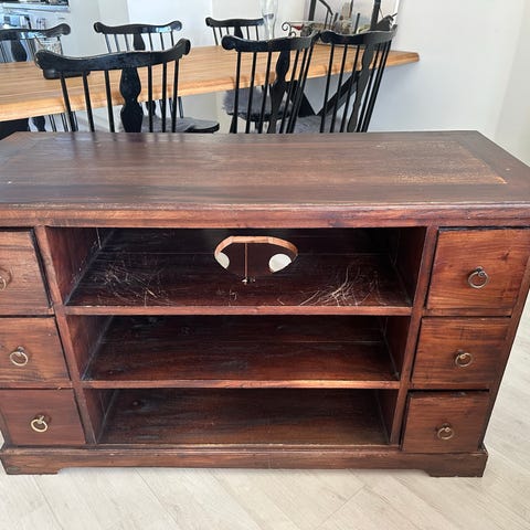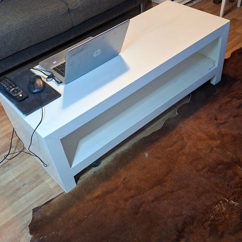 TV-taso, jossa valkoinen runko ja ruskea kansi. Huonekalu tarjoaa säilytystilaa kahdella ovella ja avoimella hyllyllä keskellä. Sopii olohuoneeseen televisiovälineiden ja muiden tarvikkeiden säilytykseen. Leveys 170cm syvyys 45cm korkeus 45cm