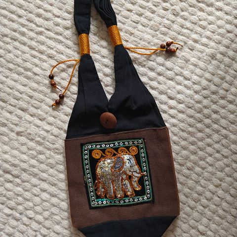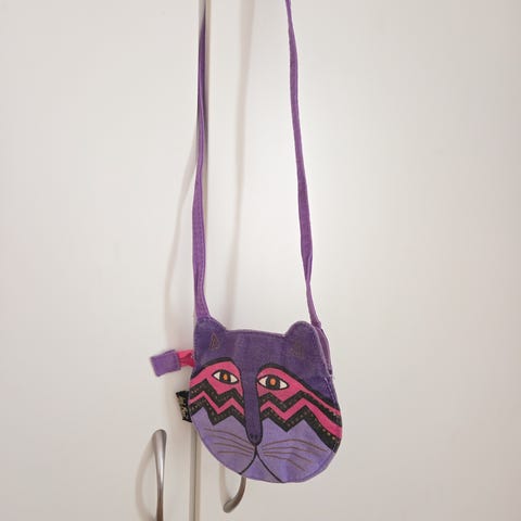 Noin 19,5cm x 23,5cm kokoinen laukku mustan kissan kuvalla :) Kaksi vetoketjua, yksi tasku. Pari kertaa käytetty.