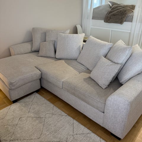 Vanha sohva, mutta edelleen tosi mukava istua ja ottaa päiväunia. Istuintyynyt ovat vähän pehmenneet, mutta muuten sohvassa ei ole silmiinpistäviä vaurioita. Istuintyynyjen alla on pientä tahraa. Lisäksi istuintyynyt valuvat helposti, mutta pysyvät hyvin liukuestemattoilla, joita saa mm. Ikeasta.