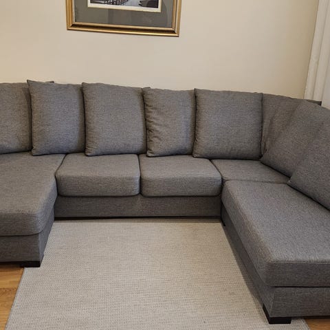 Laadukas kulmasohva. Pisin sivu 300 cm, toinen 200, lyhin 150. Irrotettavat ja pestävät päälliset istuin- ja selkätyynyissä. Meillä on vieraillut koiria. Ovh 3500-4000. Uusi sohva tulossa 15.1. Tämän luovutus niihin aikoihin.