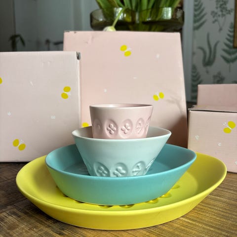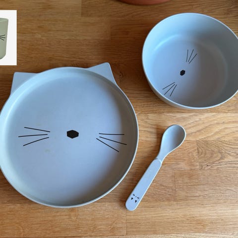 Liewood upea lasten astiasto ja lisäksi samaa sarjaa oleva pillimuki. Astiasto sisältää lautasen, syvän lautasen, lusikan, mukin sekä lisänä ostetun pillimukin. Kunto hyvä. Mukista irronnut vähän kuvaa.