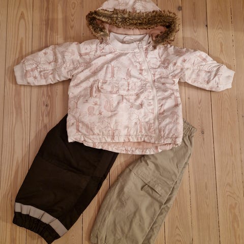 Myydään talvitakki ja toppahousut, kokoa 86. Lähes käyttämättömät. Mukaan fleecetakki ja housut 86-92.