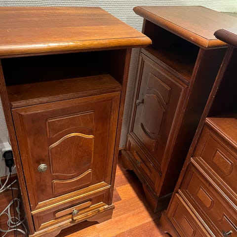 Leveys n. 45 cm ja syvyys n. 30 cm pöytälevystä. Pieniä elämän jälkiä mutta hyväkuntoiset, 3 laatikkoa ja yläosassa kaunis puukuvio. Vain molemmat yhdessä ja nouto Järvenpäästä.