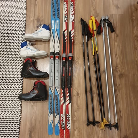 Setti on muuten yhtenäinen, sauvat vain eri merkkiset. Kaikki ovat melko uudet ja olleet vuosia varastossa käyttämättöminä, joten vain kevyt pesu/puhdistus tarpeen. Hyvä setti esimerkiksi aloittelevalle tai nuorelle hiihtäjälle.