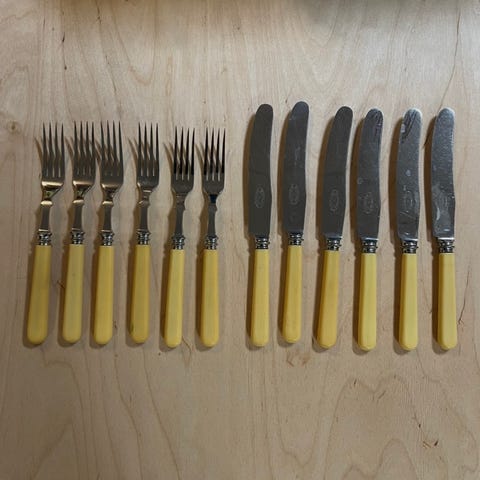 Hyväkuntoisia. Kuusi kappaletta haarukoita ja veitsiä. Nämä ovat iäkkäitä ja niissä on ajan patinaa.