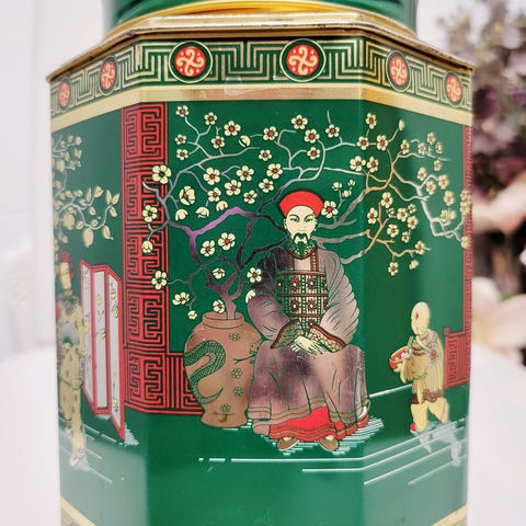 vintage kiinalaistyylinen peltinen teepurkki, jossa on itämaisia kuvioita ja teksti "CONTAINER MADE IN GT. BRITAIN