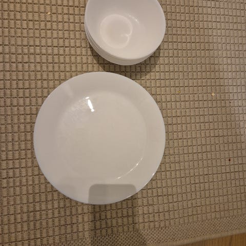 IKEAsta peräisin oleva astiasto, johon kuuluu 4 kpl 25 cm ruokalautasta, 2 kpl 19 cm lautasta, 4 kpl 15 cm kulhoa sekä 1 isompi 23 cm tarjoilukulho. Muutamassa on pienet, lähes huomaamattomat kolhut reunassa, mutta muuten siistikuntoisia ja ehjiä.