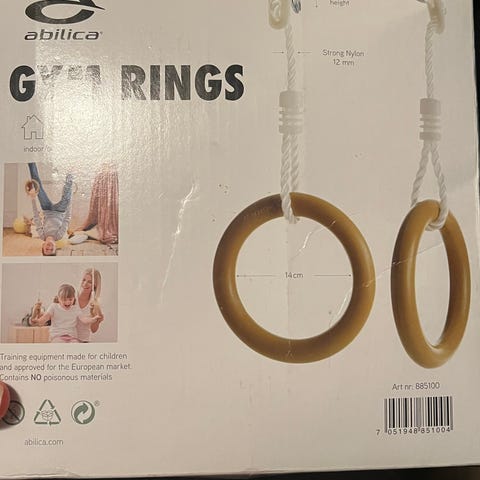 Upeat puiset voimistelurenkaat sekä niihin kuuluvat kiinnitysremmit ja kattokiinnikkeet. Todella laadukkaat ja kestävät! Suomen Voimistelutuotteelta hankitut ja edelleen myynnissä, hinta kokonaisuudelle uutena 129€.