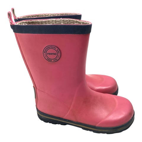 Toisen saappaan takasauma on mystisesti revennyt. Ks. kuva. Isommissa lätäköissä leikki vaatii siis saappaan paikkausta. Muuten käyttökelpoiset. Värissä tummentumaa ja pohjalliset kuluneet.