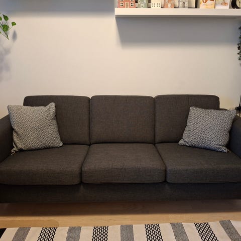 Sohva on ollut todella vähällä käytöllä. Meillä ei ole eläimiä, eikä meillä tupakoida. Täysin tahraton ja täysin ehjä sohva. Istuinosan syvyys on 53 cm. Kolmen istuintyynyn päälliset on vetoketjulla, joten ne voi pesua varten irrottaa.