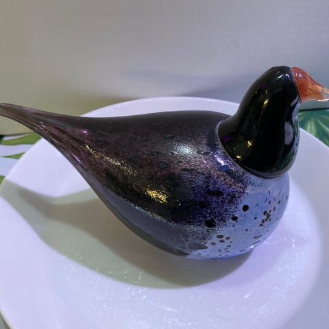 Iittala Lintu lasilintu violetti. Koriste-esine, joka on valmistettu lasista. Violetti väri vaihtelee sävyiltään. Muodoltaan linnun kaltainen.
