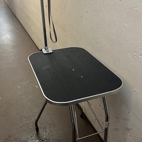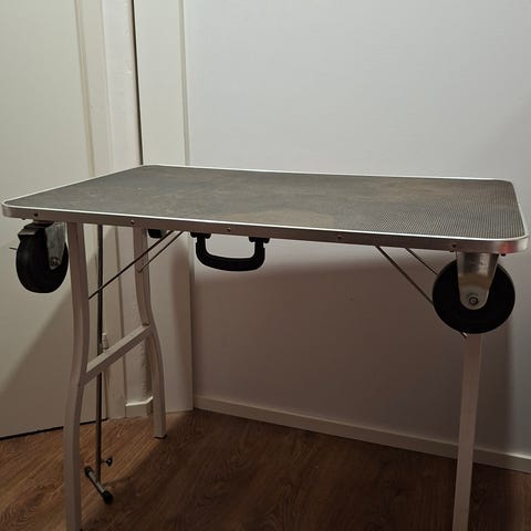 Vedettävä trimmauspöytä jossa on pyörät helppoa siirtämistä varten. Pöytälevy on tukevaa materiaalia ja pöydän jalat ovat metallia. Tällä voit vetää näyttelypaikallle kaiken maallisen omaisuuden. Trimmaustanko mukana jonka juuressa pieniö ruostetäpliä, ei ole kokeiltu siistiä Vähän käytetty, vedossa ollut ehkä kerran, muutoin toimittanut kotipöytänä oloa. Pöytälevyn koko 60×91. Vain nouto.