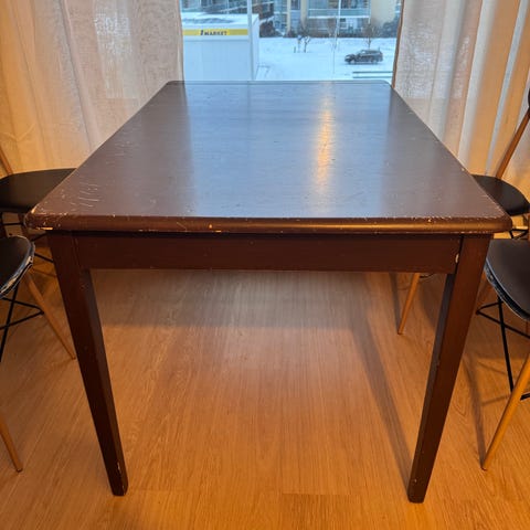 Annetaan valkoinen jyskin ruokapöytä, halkaisija 100cm. Pöydän pinnassa ja jalassa on pientä kulumaa. Tuolit ei sisälly