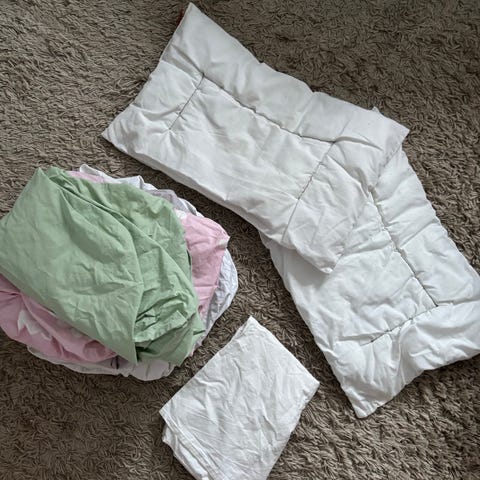 Vauvan petivaatesetti. Sisältää tyynyn, peiton ja petarin.