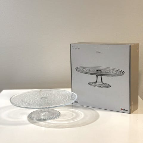 Iittala Kastehelmi kakkuvati/ tarjoilulautanen, valmistettu lasista. Tarjoilulautanen on kirkas ja siinä on koristeellinen helmikuviointi. Sopii tarjoiluun ja kattaus