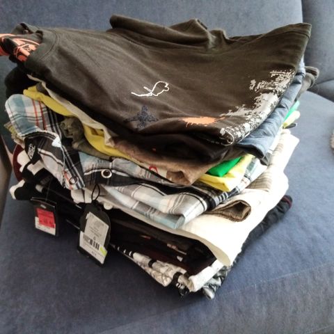 10 t-paitaa, 1 polo t, 6 pitkähihaista, 5 neuletta, Björn Borg housut ja Jack&Jones Parkatakki