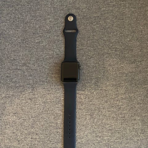 Myydään ulkoisesti hyvässä kunnossa oleva Apple Watch Series 3 -älykello, koko 38mm ja väri Space Gray Aluminum, mukana musta Sport Band -ranneke kahdella pituusvaihtoehdolla.
