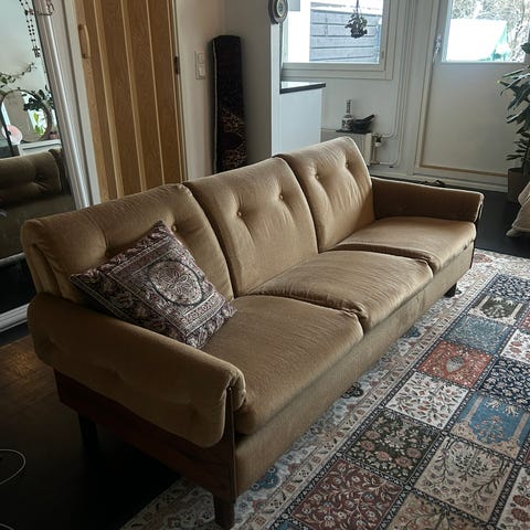 Vintage sohva, täydellinen ruokapöydän pariksi. Ei niin syvä, vähän korkeampi istuinkorkeus ja istuin on jämäkkä.