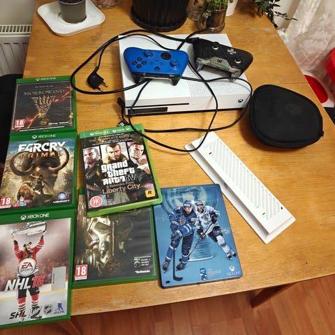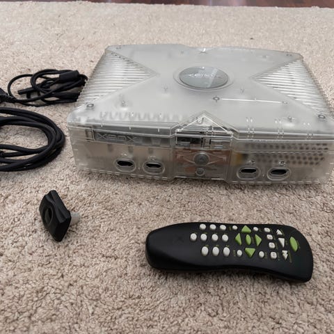 Microsoft Xbox pelikonsoli musta väri. Sisältää kaksi ohjainta ja tarvittavat kaapelit. Pelikonsoli on alkuperäinen malli, tarkoitettu pelaamiseen.